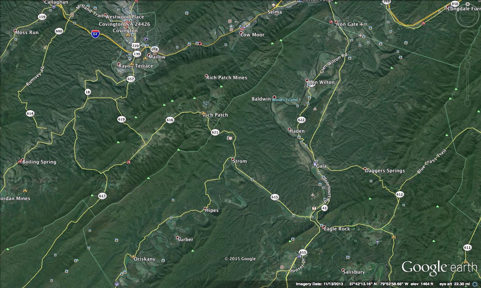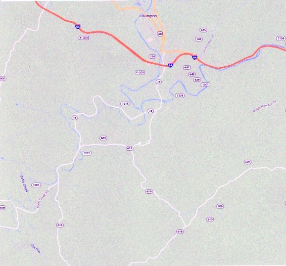 At any event, Price’s Turnpike started at the mouth of Craig’s Creek, and followed current State 615 to New Castle. There is turned northwest up Barber’s Creek on State 617. It went around the western end of Rich Patch Mountain to State 616, and then down the north side of the Allegheny on State 18 to rejoin US 60 and I- 64 at Covington. We do not know its western terminus, but it likely was modern White Sulfur Springs (the old name was Blue Sulfur Springs), where it joined the Lewisburg to Blue Sulfur Springs Turnpike.